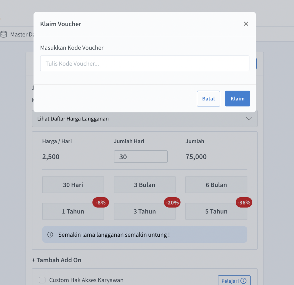 Sistem akan memvalidasi kode voucher yang Anda masukkan. Jika kode valid, akan muncul notifikasi bahwa klaim voucher berhasil dan jumlah hari langganan Anda akan bertambah secara otomatis. Langganan Anda kini sudah diperbarui!