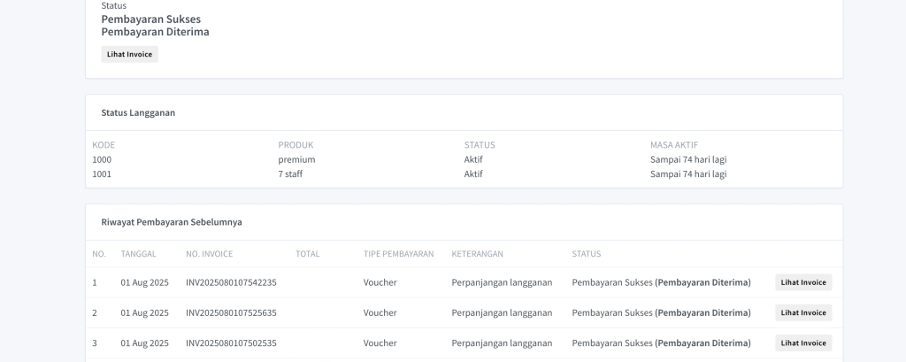 Untuk memastikan klaim voucher Anda sudah tercatat dengan benar, Anda bisa melihat detailnya di menu “Riwayat Pembayaran”. Di sana, Anda akan menemukan invoice khusus untuk voucher yang Anda klaim, lengkap dengan informasi tanggal dan jumlah hari yang ditambahkan.