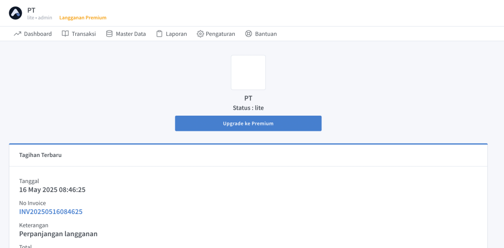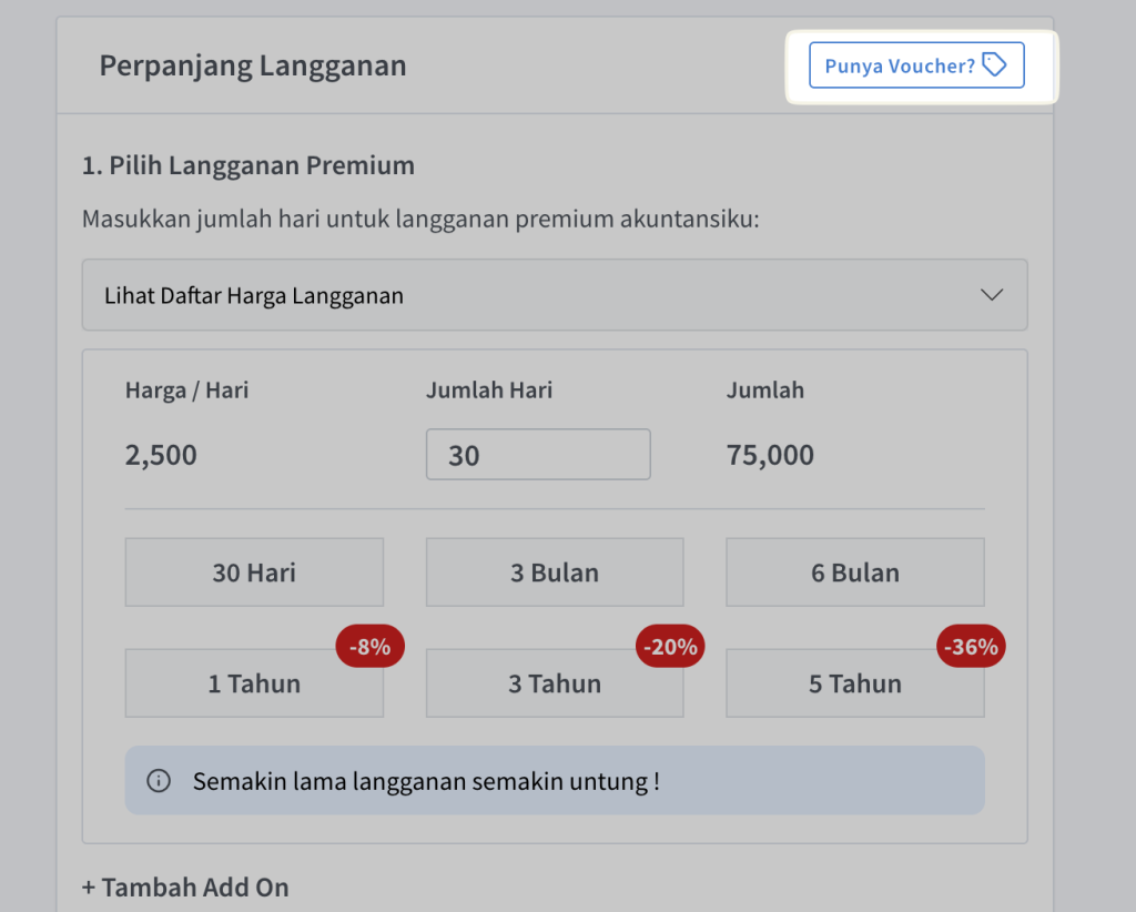 Pastikan Anda membeli paket langganan yang sedang dipromosikan, misalnya Langganan 1 Tahun. Lakukan pembelian melalui website atau aplikasi Akuntansiku.