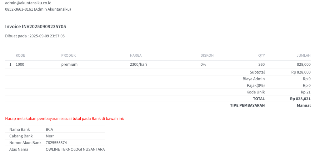 Kirimkan bukti invoice yang sudah Anda simpan ke WhatsApp Admin Akuntansiku. Pastikan Anda menyertakan detail akun dengan format berikut untuk mempercepat proses verifikasi: