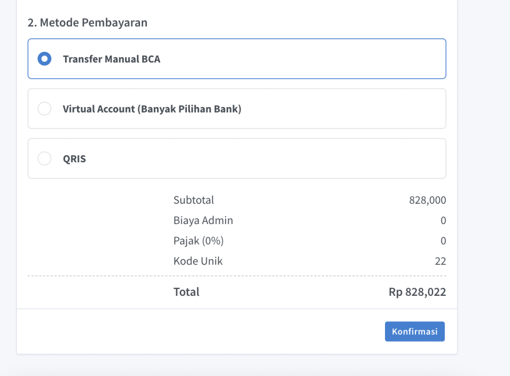 Pilih metode pembayaran yang tersedia: Transfer Manual BCA, VA & QRIS.